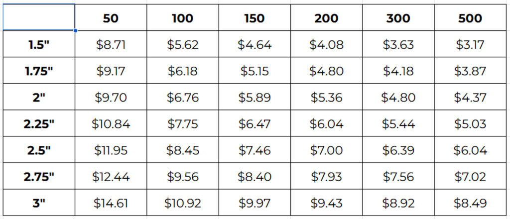 Reorders for any quantity must be submitted within 20 days of delivery. After this period a $10 set-up fee and a minimum quantity of 50 pieces may be charged.